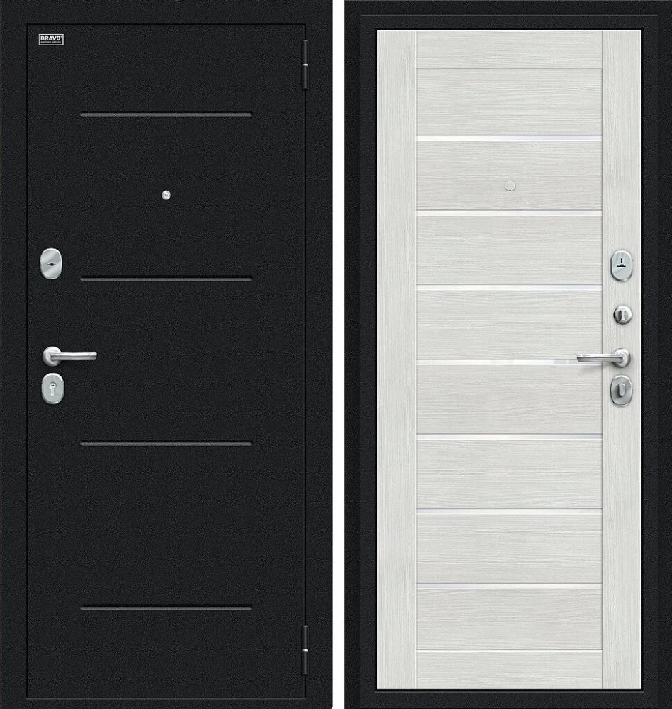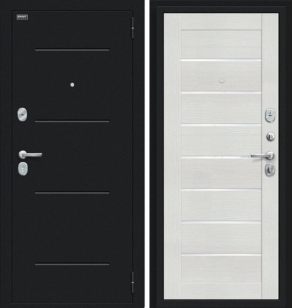Надежная входная Дверь Браво Техно Букле черное/Bianco Veralinga премиум класса по цене 31 481 руб. Большая толщина стали защитит от проникновения в ваш дом, квартиру или коттедж. Используется очень качественная фурнитура: замки, цилиндры, ручки, защелки. Покрытие и отделка двери изготовлено под внимательным контролем производителя. Дверь имеет долгий срок службы и гарантию.