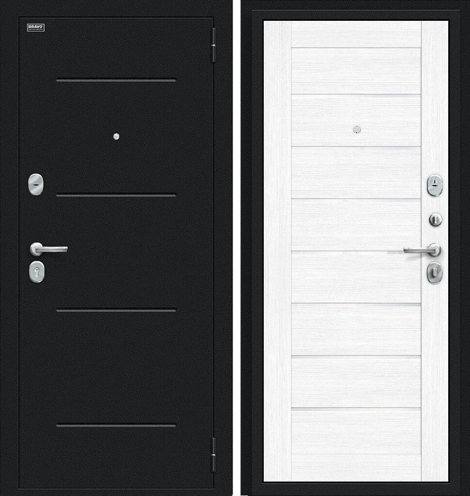 Надежная входная Дверь Браво Техно Букле черное/Snow Melinga премиум класса по цене 31 481 руб. Большая толщина стали защитит от проникновения в ваш дом, квартиру или коттедж. Используется очень качественная фурнитура: замки, цилиндры, ручки, защелки. Покрытие и отделка двери изготовлено под внимательным контролем производителя. Дверь имеет долгий срок службы и гарантию.
